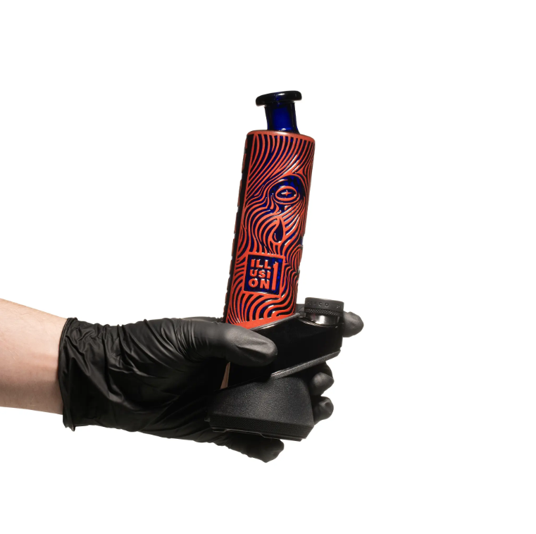 Illusion 1: Grandiose is a Puffco-compatible wet top with built-in perc, finished in our signature Technicolor Dreamwork process. This piece marks the debut of the Illusion Collection — a visual meditation on identity, ambition, and transformation, where waveform patterns sculpt emotional states into bold, symbolic faces.